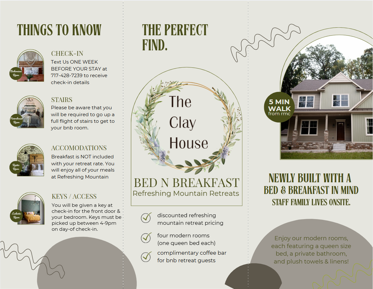 Our off-site lodging options provide the same refreshing environment of staying on our campus. A short walk or drive (2 min) from Refreshing Mountain these are unique restful spaces. Check-in instructions and amenities vary. Below you will find helpful instructions and FAQs for these options. Enjoy your stay!